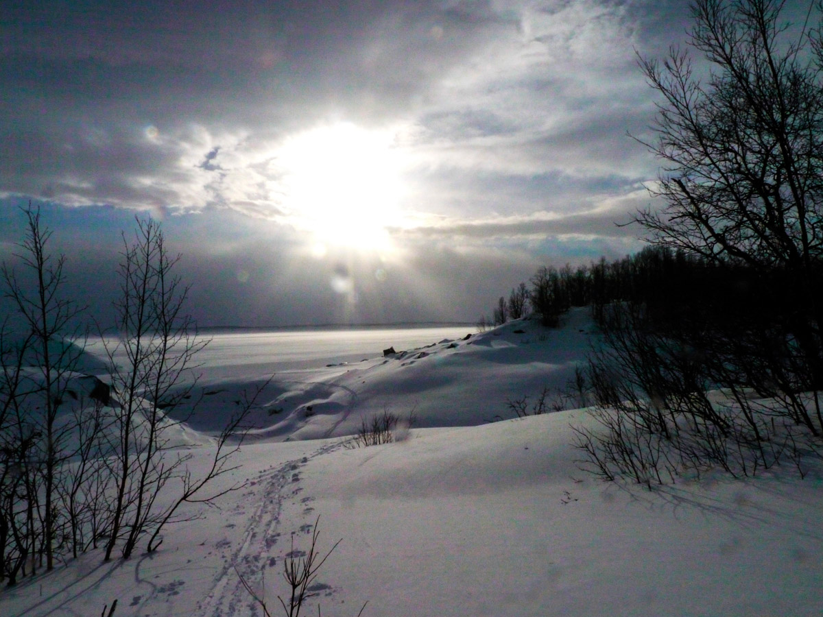 Während des Rückweges über den See lässt der Wind etwas nach, die Sicht wird besser, der Schnee friert durch, sodass die Pulka leichter läuft. Ich verliere den 2. Stockteller- was für ein Schrott an neuen, teuren Stöcken!