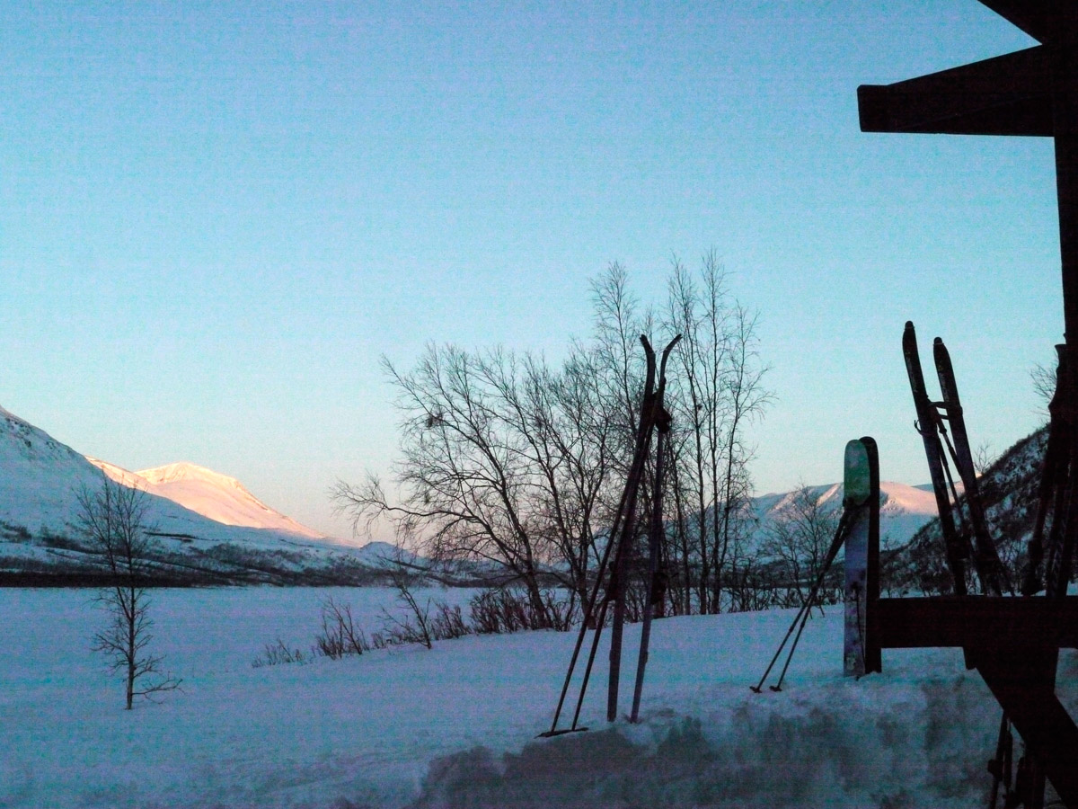 (Hütten in Schweden: kein Licht, kein Strom, kein Wasser- aber € 35.- die Übernachtung. Eine Wasserstelle ist 100 m entfernt- dort kann man das Eis aufschlagen und flüssiges Wasser schöpfen. Die Toilette ist 200 m (!) entfernt; der Gang dorthin verlangt, sich mit Anorak, Mütze, Handschuhe, Überhose zu versehen, die Skistiefel anzuziehen, um dann durch tiefen Schnee dorthin zu waten. Dabei bricht man min. 4 x bis zum Bauch ein).