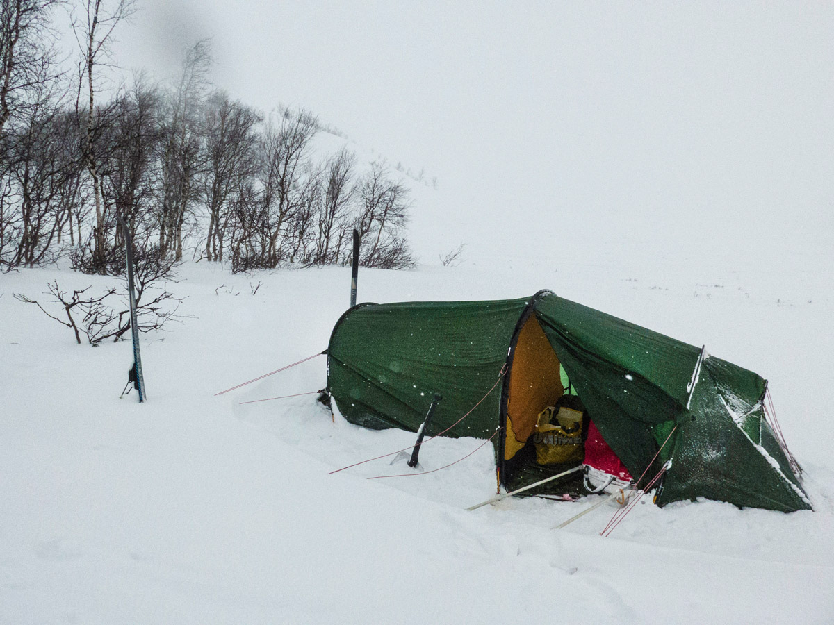 Ich grabe also am frühen Morgen trotz anhaltendem Schneesturm die Heringe in 30 cm Tiefe heraus und packe alles zusammen.