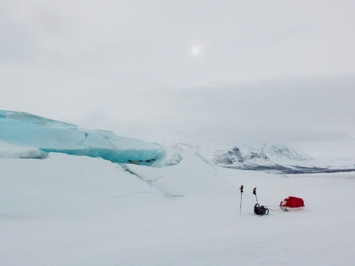 5 m über einem senkrechten Abbruch- auf Blankeis. Die Pulka rutscht sofort nach unten und zieht mächtig Richtung Abgrund. Nerven behalten!