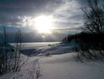 Plötzlich breche ich nach einer kleinen Abfahrt mit dem linken Ski 1,5 m (!) tief ein, der rechte bleibt oben. Es dauert lange, bis ich mich mit den Händen zur Bindung vorgraben kann, um diese zu lösen. Dann befreie ich mich nach und nach von Rucksack, Pulka und rechtem Ski. Zuletzt schaufle ich mit der Schneeschaufel meinen linken Ski frei. Alles nochmal gutgegangen! Ursache des ganzen: eine kleine Holzbrücke, 1 ½ m mit Schnee bedeckt, die ich nur mit dem rechten Ski traf- der linke bohrte sich neben der Brücke bis unter die Holzbeplankung.
