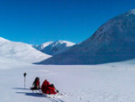 Die Hütte ohne Toilette (siehe hinten!) lasse ich rechts liegen und schwenke westlich ab ins Kaitumjakka- Tal. Dort ist's eisig kalt: in strahlender Sonne und Windstille messe ich um 12:30 h minus 30°C. Die tiefste Temperatur, die ich je erleben durfte! Da fällt die Mittagspause noch kürzer als ohnehin gewohnt aus.