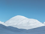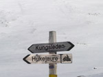 Gegen 14:00 h erreiche ich den Beginn des Abstiegs. Noch ein paar Kurven auf Ski, dann heißt es zu Fuß absteigen. Der Schnee wird immer weicher, ich breche ständig ein.
