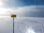 Ich starte früh bei leichtem Schneefall. Schon bald aber kommt starker Schneesturm auf, der den ganzen Tag anhalten wird. Die Sicht ist minimal, die Pulka sehr schwer zu ziehen.