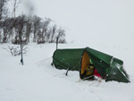 Um 16:00 h ist es fast dunkel. Ich bau' in vollem Schneesturm mein Zelt auf. Gott-sei-Dank bin ich