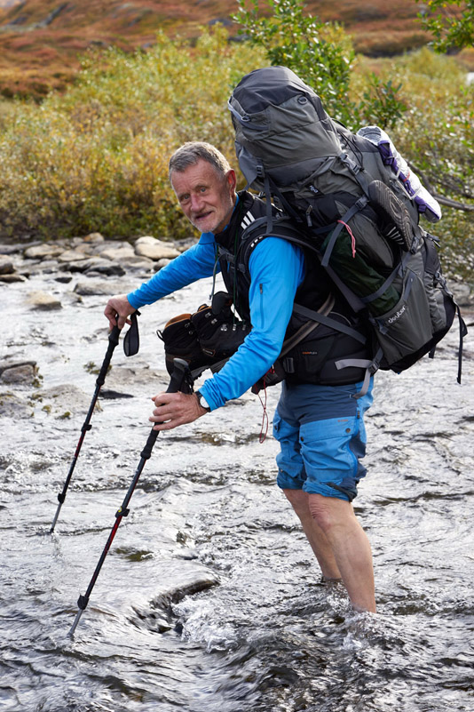 Gutes Wetter, unterwegs eine längere Furt. Ab Roysvatn keine Markierung mehr, auch keine Pfad- oder Trittspuren. Orientierung mit GPS. Wir zelten am Svartitjavrre. |