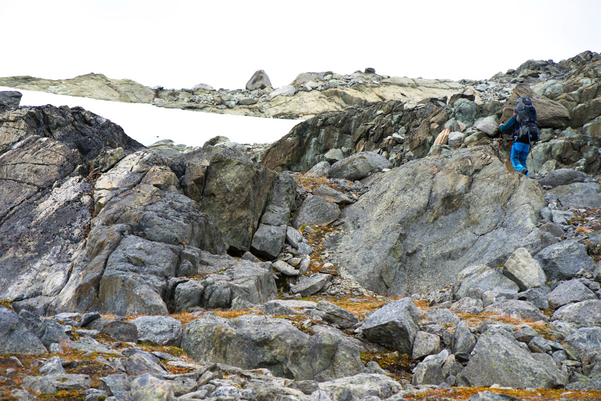 Nach dem Gautelisvatnet 10 harte, anstrengende Kilometer durch nervtötende, endlose Blockfelder. Haxenbrecher- Gelände!