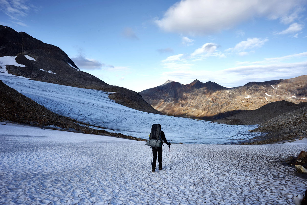 Leichter Niesel zum Start. Gleich beginnt der lange Aufstieg zum Smailerien- Pass. Alpines Gelände und kleine Gletscher.