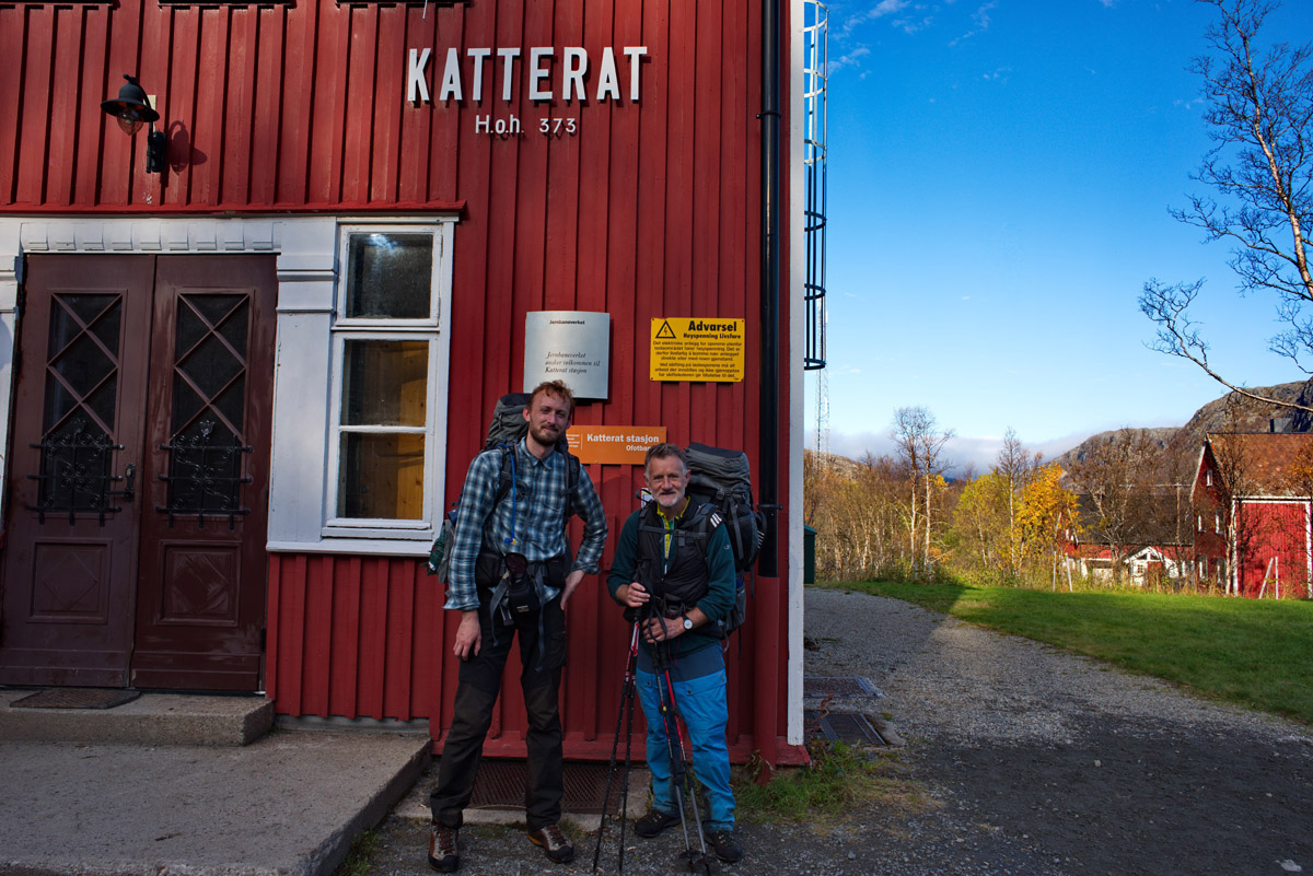 Dann langer Abstieg Richtung Katterat. Die letzten 500 m müssen wir uns per Garmin durch morastigen, steilen Birkenwald kämpfen. Wir kommen aber punktgenau raus und sind um 14:30 am Ziel: Katterat Stasjon. |