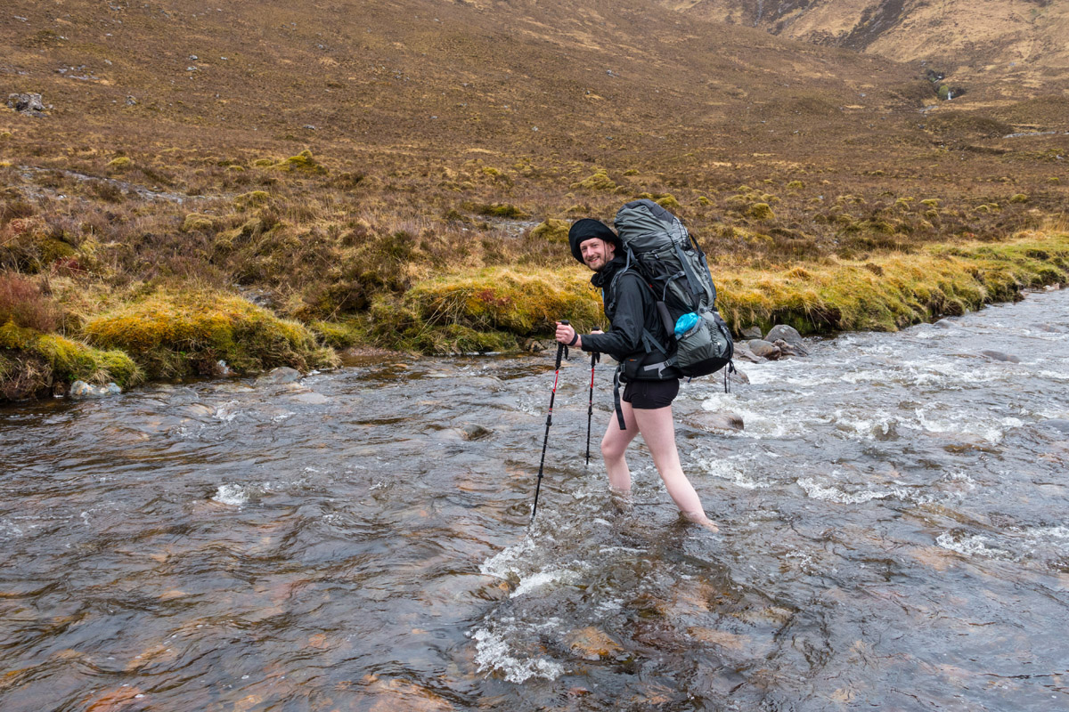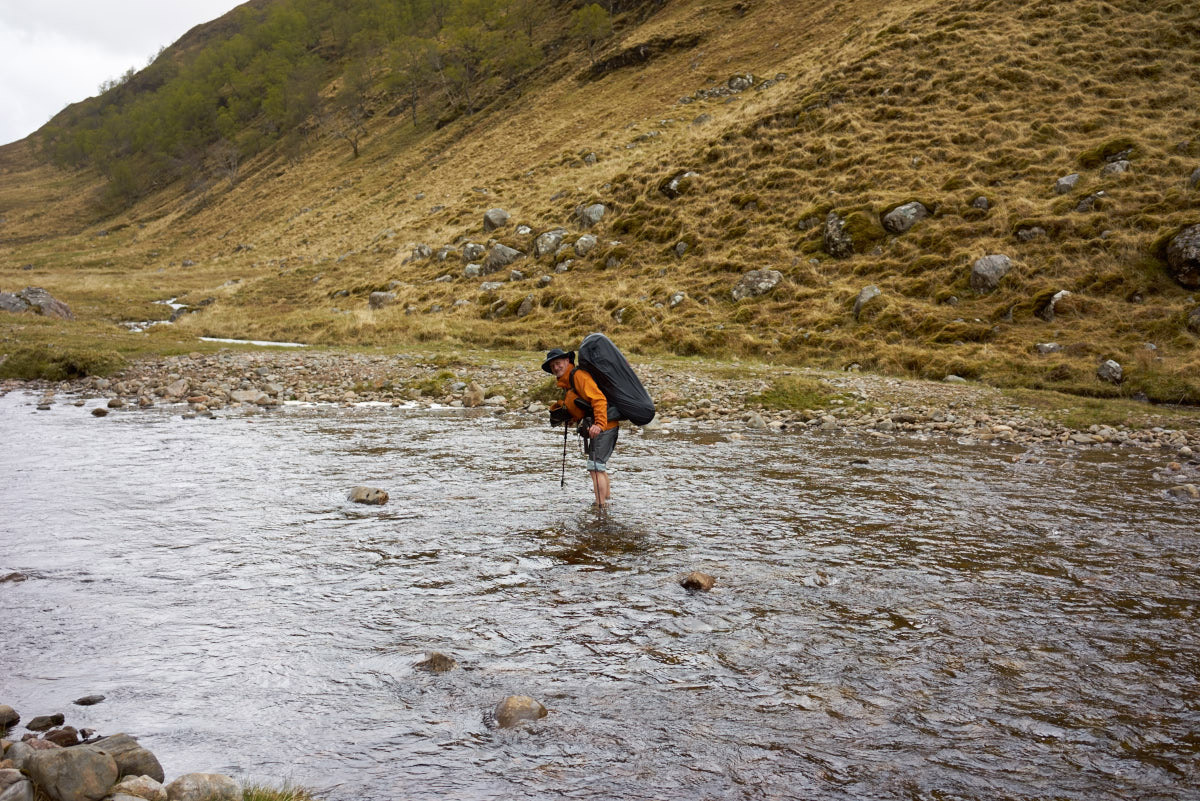 Im Anstieg eine schwierige Furt über den Allt Cuirnean, riesige Wassermassen strömen die Hänge herunter. Jeder Schritt bedeutet waten durch tiefen Sumpf- eine anstrengende Übung!