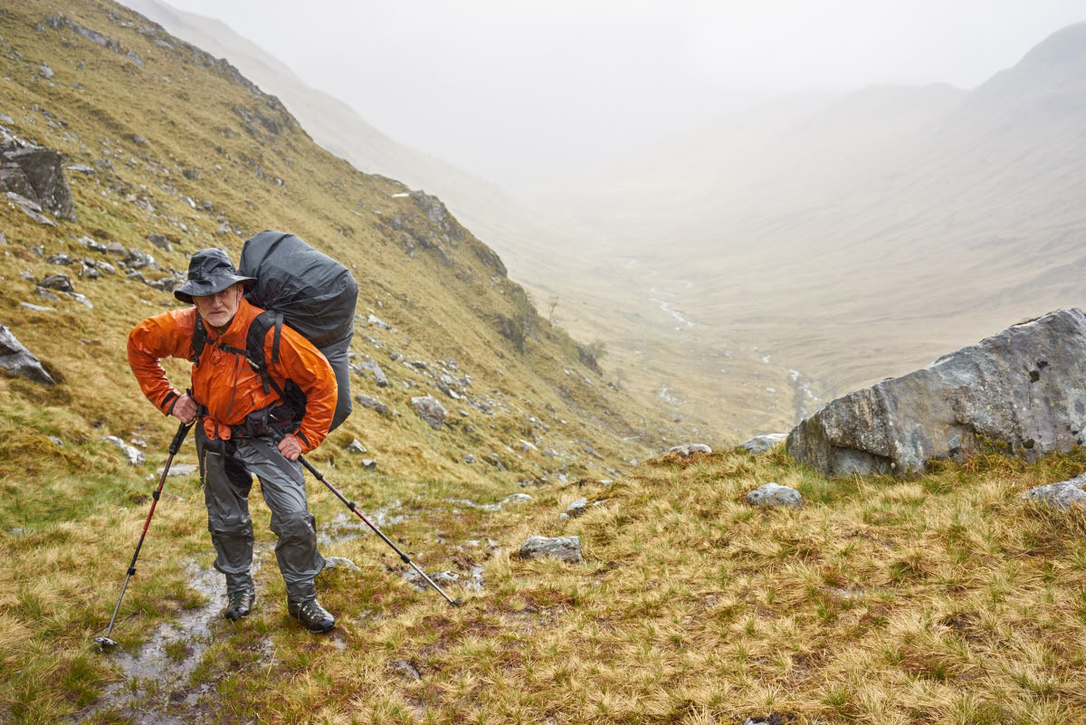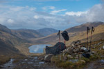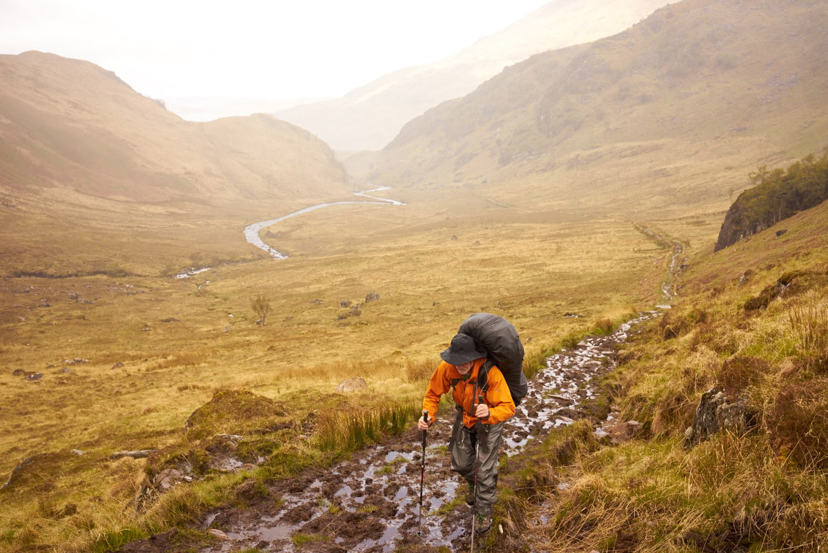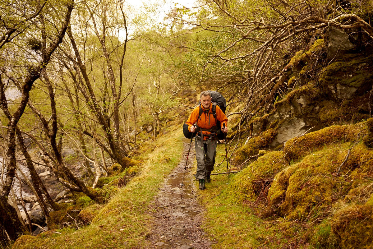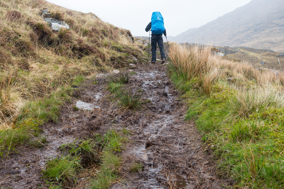 Heute starten wir früh zum langen, aber leichten Passanstieg auf den Mam Meadail. Anfangs führt ein schöner Pfad durch ein romantisches enges Tal. Bald wieder starker Regen während des gesamten Anstiegs, am Pass dann kräftiger Hagel.