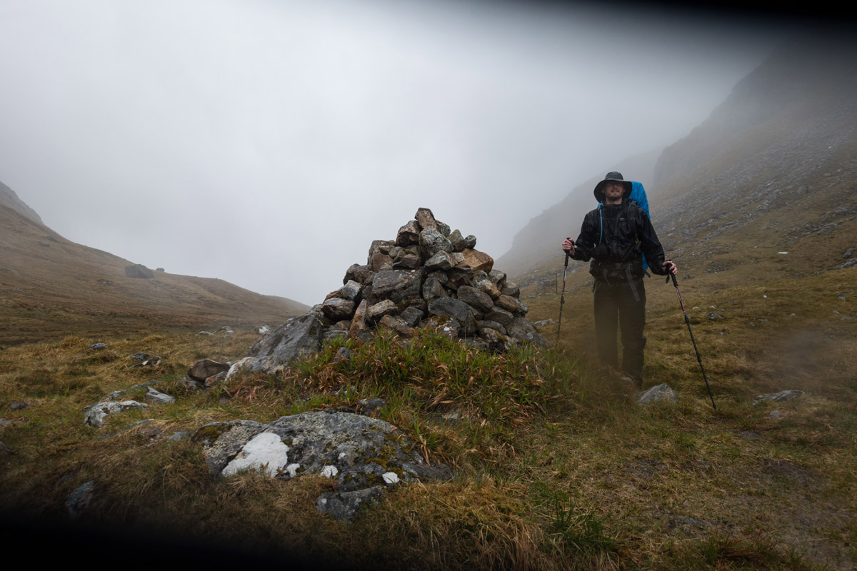 hohen Mam Barisdale- Pass, der uns mit einer 5-minütigen Sonneneinlage begrüsst. Der Abstieg ist extrem nass und sumpfig.